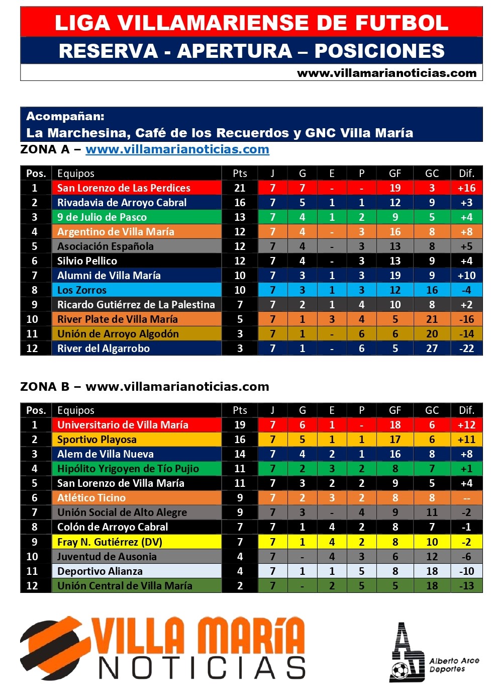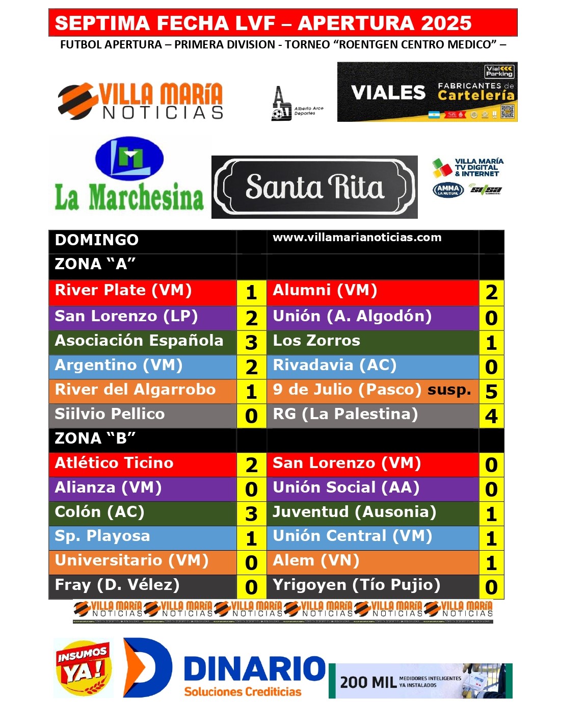 San Lorenzo de Las Perdices, con goles de Pellizari y Toledo, derrotó 2-0 a Unión de Arroyo Algodón y Asociación Española 3-1 a Los Zorros. Ferreyra, Raspo y Corvalán marcaron para los gallegos y Heredia para Los Zorros.