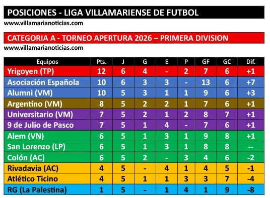 Asociación Española logró el triunfo más resonante en su historia en los torneos de la Liga Villamariense de Fútbol al vencer por 5-0 a Hipólito Yrigoyen como visitante en el único encuentro adelantado de la sexta fecha del torneo Apertura de la Divisional A. : Camilo Ferreyra, Tomás Trullet, Rodrigo Arias, Francisco Pérez y Rodrigo Castillo anotaron los goles de la abultada victoria del gallego, que alcanzó a Alumni en la posición de escolta.